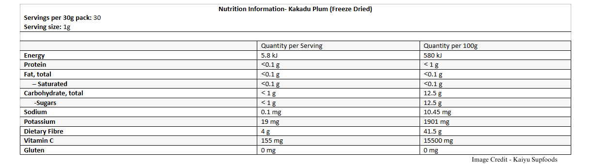 Kakadu Plums are Australia’s own natural superfood, renowned for being one of the richest natural sources of Vitamin C in the world — the flesh contains up to 100 times more Vitamin C than oranges. Kaiyu Superfoods uses premium-quality Kakadu Plums sourced from Indigenous communities in the Northern Territory, containing even higher Vitamin C levels than Camu Camu or Açaí — with far fewer food miles since they’re grown right here on Australian Country.